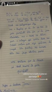 “Leksionet më të mëdha të jetës na i japin fëmijët” – shkruan Arbana në një Instastory ku ka postuar letrën që i ka shkruar djali i saj./pamfleti.net