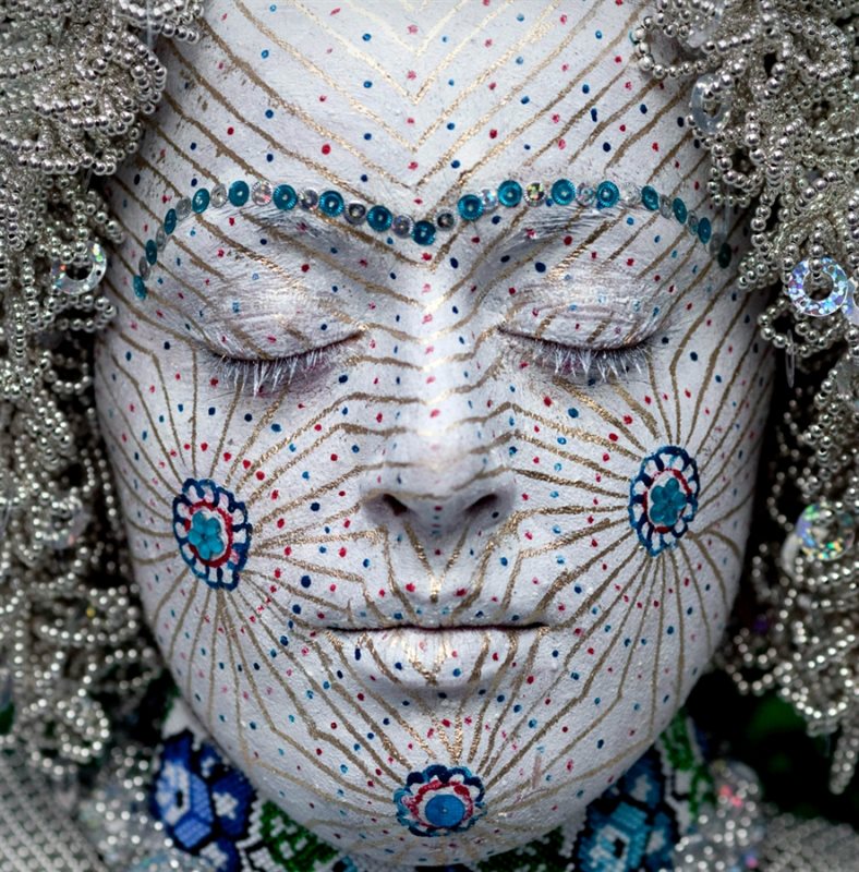 Më pas fytyra e nuses pikturohet me shumë ngjyra në shtresa të mrekullueshme ngjyrash. Tre rrathët e artë simbolizojnë ciklet e jetës, të lidhur njëri me tjetrin nëpërmjet linjave të arta, të cilat njeriu i kalon në kohëzgjatjen e jetës së vet. Rrathët e brendshëm të kuq, janë simbolet e pjellorisë, prej nga ku pikat e kuqe dhe blu lindin dhe e tërë fytyra mbulohet prej tyre, duke i uruar asaj një familje të lumtur e të shëndetshme.