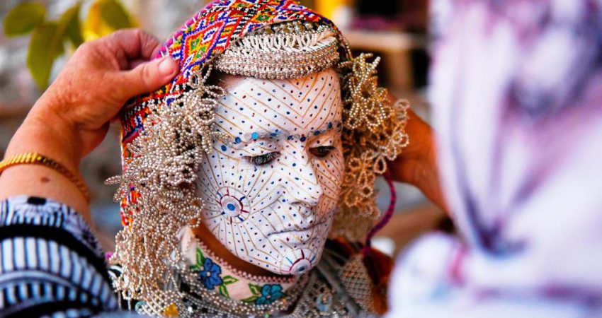 Nusja e ka fytyrën të lyer për të parandaluar fatin e keq në ditën e dasmës. Procesi i këtij grimi kërkon që fytyra së pari të lyhet me krem të bardhë, ndërsa më pas bëhen vija me pluhur nga ari dhe vizatohen rrathët si simbol i qiellit.