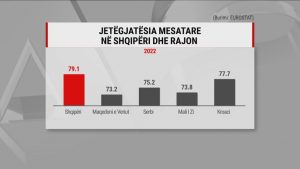 Mesatarisht shqiptarët jetojnë 79.1 vite duke arritur kështu përsëri nivelin e 2019. Edhe pse jemi poshtë mesatares së Bashkimit Evropian, krahasuar me rajonin ne kemi moshën më të lartë të jetëgjatësisë. Pas Shqipërisë, vjen Kroacia me 77.7 vjet, Serbia 75.2 vjet, Mali i Zi 73.8 vjet (2021) dhe më pak nga të gjithë Maqedonia e Veriut me 73.2 vjet (2021). Për Kosovën nuk ka të dhëna.