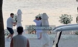 Në video dallohet momenti “përrallor” kur Pavard i propozon për martesë partneres së tij në bregdetin e një resotri turistik në Sarandë.