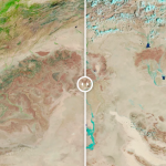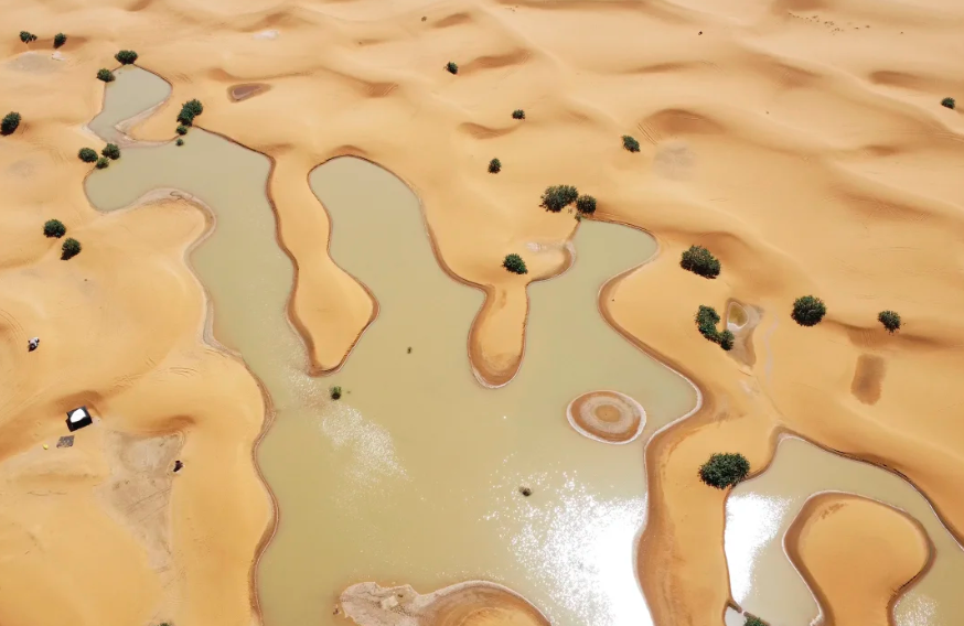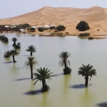 Ndërsa shiu rridhte mbi terrenin e shkretëtirës, ​​ai krijoi një peizazh të ri, me ujë mes palmave dhe florës së shkretë.