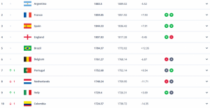 Kryesimin vijon ta mbajë Argjentina, e cila ndiqet nga Franca dhe Spanja, teksa Anglia dhe Brazili plotësojnë 5 vendet e para.