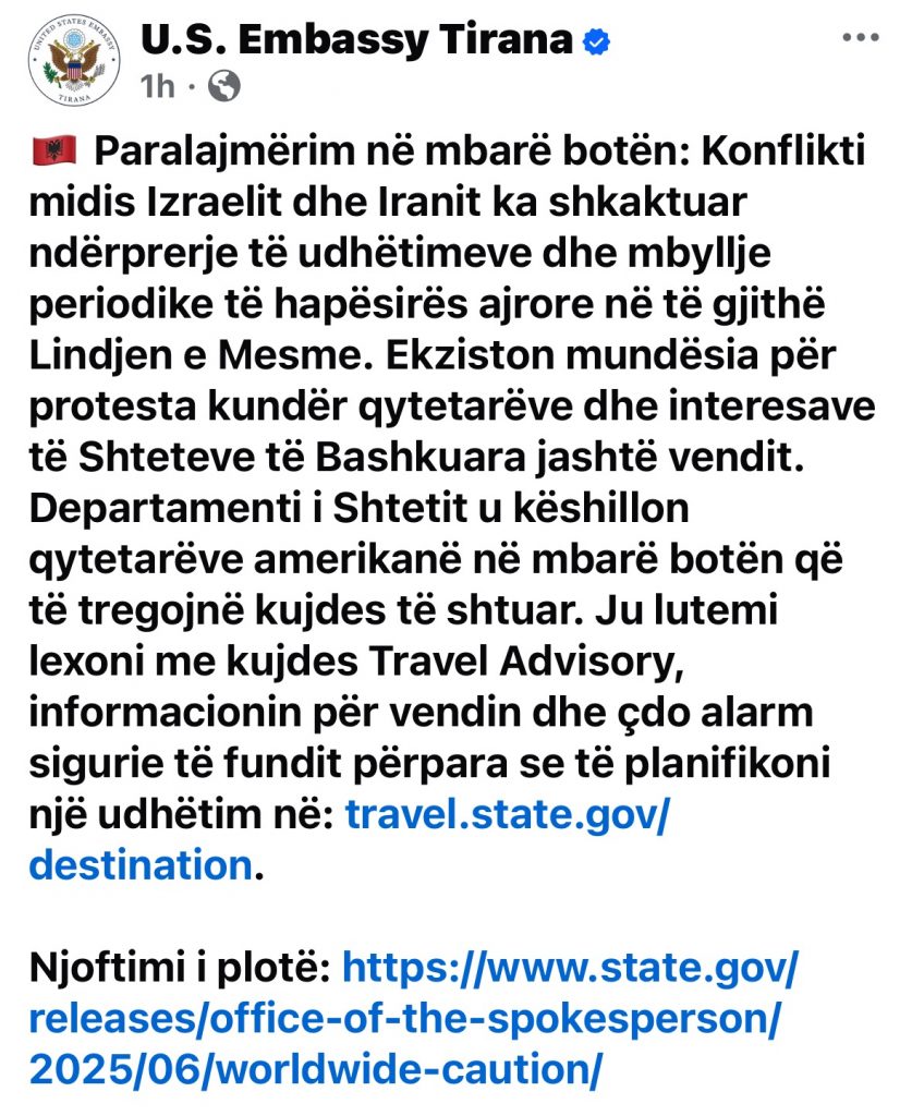 “Paralajmërim në mbarë botën: Konflikti midis Izraelit dhe Iranit ka shkaktuar ndërprerje të udhëtimeve dhe mbyllje periodike të hapësirës ajrore në të gjithë Lindjen e Mesme. Ekziston mundësia për protesta kundër qytetarëve dhe interesave të Shteteve të Bashkuara jashtë vendit. Departamenti i Shtetit u këshillon qytetarëve amerikanë në mbarë botën që të tregojnë kujdes të shtuar. Ju lutemi lexoni me kujdes Travel Advisory, informacionin për vendin dhe çdo alarm sigurie të fundit përpara se të planifikoni një udhëtim në: travel.state.gov/destination.”