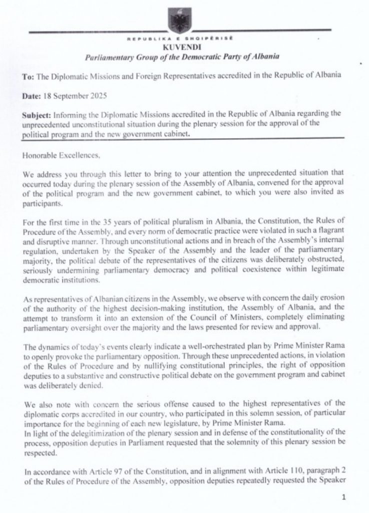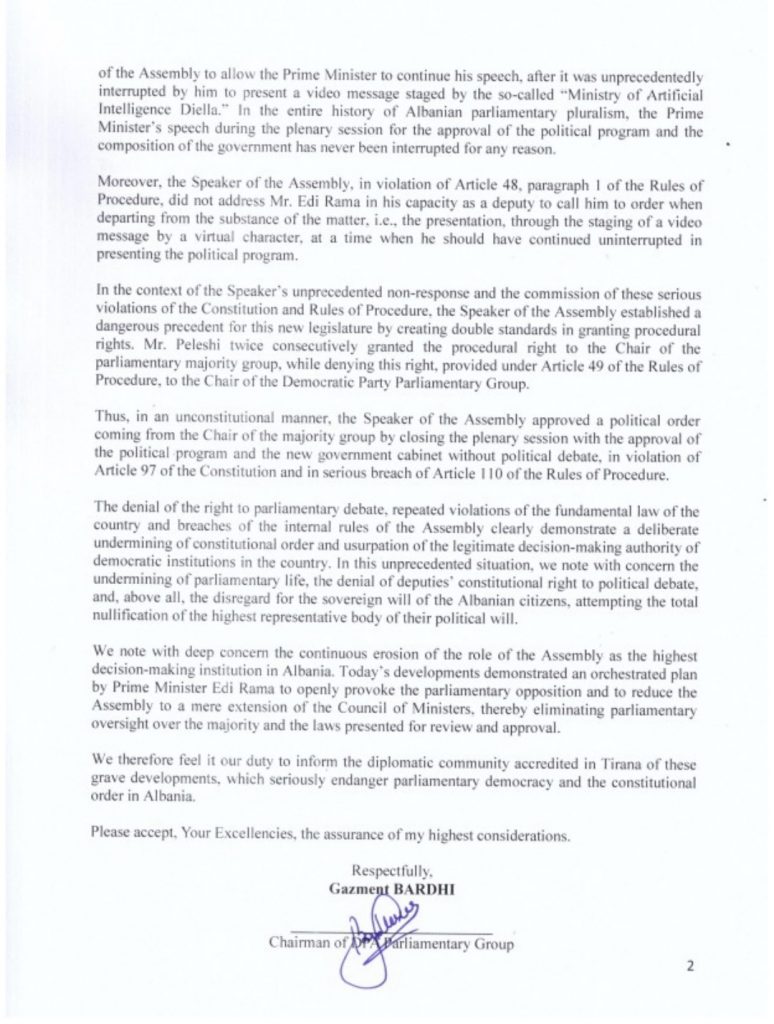 Grupi parlamentar i Partisë Demokratike, përfaqësuar nga kreu Gazment Bardhi, ka njoftuar misionet diplomatike dhe përfaqësuesit e huaj në Shqipëri me anë të një letre për situatën e krijuar gjatë seancës plenare ku u miratuan programi politik dhe kabineti qeveritar. Sipas PD-së, ky proces është zhvilluar “nga shumica parlamentare” pa respektuar debatin parlamentar dhe procedurat kushtetuese dhe rregulloren e Kuvendit.