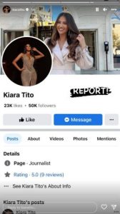 Kiara Tito ka reaguar së fundmi ndaj një faqeje që i është hapur në Facebook në emër të saj. Kjo llogari numëron mijëra ndjekës, ndërsa moderatorja u ka kërkuar fansave të saj ta ndihmojnë që ta mbyllë pasi nuk është e saj.