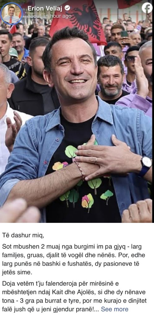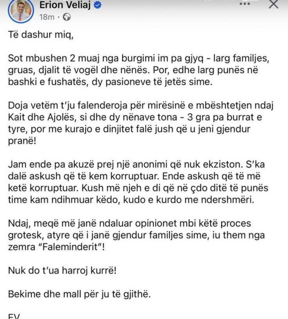 Në mesazhin e tij, Veliaj thekson se është larg familjes, punës dhe fushatës, duke e cilësuar procesin ndaj tij si “grotesk”. Ai shprehet se nuk ka dalë ende asnjë person që ta ketë akuzuar për korrupsion, ndërsa falënderon ata që kanë mbështetur familjen e tij gjatë kësaj periudhe.