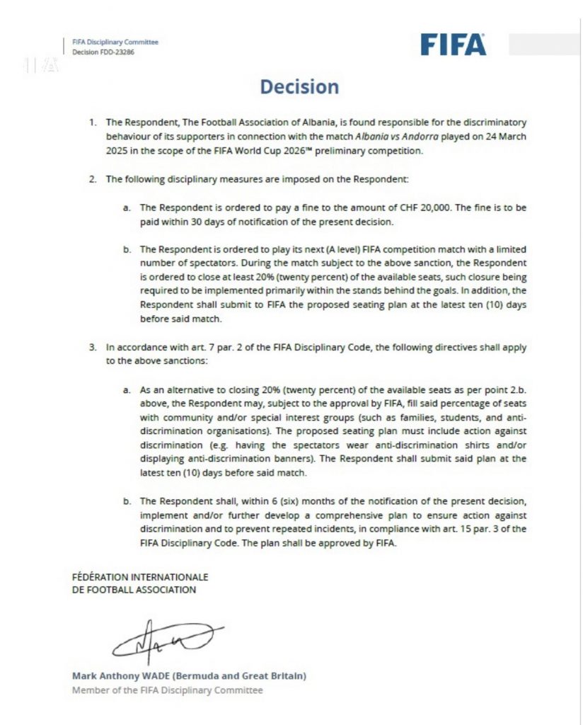 Federata Shqiptare e Futbollit (FSHF) është gjobitur nga FIFA pas sjelljes diskriminuese të tifozëve shqiptarë gjatë ndeshjes kualifikuese për Botërorin 2026 ndaj Andorrës, e zhvilluar më 24 mars 2025 në stadiumin “Arena Kombëtare”.