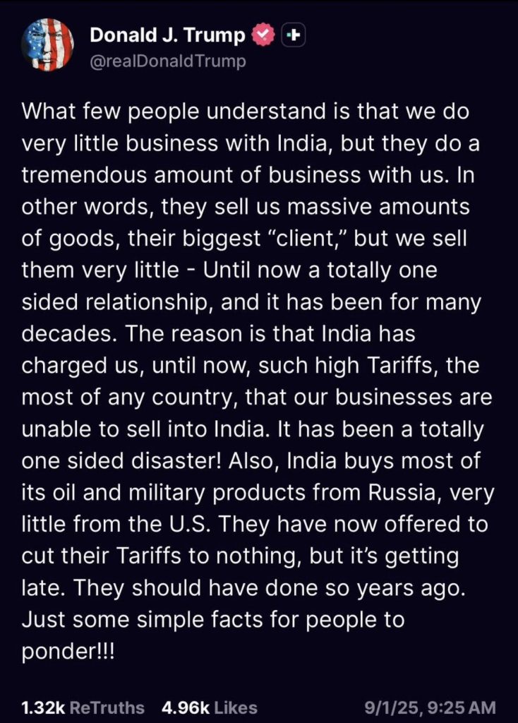 Ajo që pak njerëz e kuptojnë është se ne bëjmë shumë pak biznes me Indinë, por ata bëjnë një sasi të jashtëzakonshme biznesi me ne. Me fjalë të tjera, ata na shesin sasi të mëdha mallrash, “klientin” e tyre më të madh, por ne u shesim shumë pak – Deri më tani një marrëdhënie krejtësisht e njëanshme, dhe kështu ka qenë për shumë dekada. Arsyeja është se India na ka ngarkuar, deri më tani, tarifa kaq të larta, më shumë se çdo vend tjetër, saqë bizneset tona nuk janë në gjendje t’i shesin në Indi. Ka qenë një katastrofë krejtësisht e njëanshme! Gjithashtu, India blen shumicën e produkteve të saj të naftës dhe ushtarake nga Rusia, shumë pak nga SHBA-ja. Ata tani janë ofruar të ulin tarifat e tyre në zero, por po bëhet vonë. Duhet ta kishin bërë këtë vite më parë.”