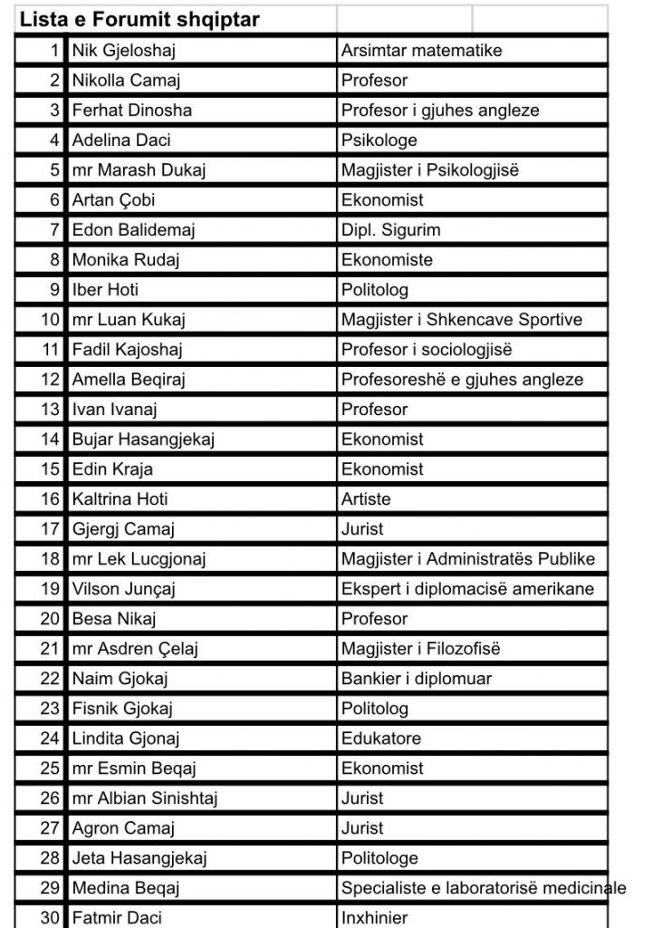 Fryma zhvillimore dhe progresive e Forumit shqiptar dëshmohet nga përbërja e listës zgjedhore, e cila përbëhet nga intelektualë të rangut europian, me përvojë dhe të rinj, gra të suksesshme të komunitetit tonë, ekspert të dëshmuar në fushat e tyre, inxhinierë, juristë, politologë, ekonomistë, profesorë etj.