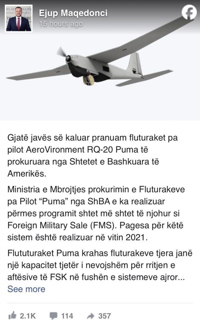 Ministri i Mbrojtjes së Kosovës, Ejup Maqedonci, ka njoftuar se shteti ka pranuar gjatë javës së kaluar pajisje ushtarake — dronë të tipit AeroVironment RQ-20 Puma — të siguruara nga Shtetet e Bashkuara të Amerikës përmes programit Foreign Military Sale (FMS). Pagesa dhe procesi i kontratës ishin realizuar në vitin 2021.