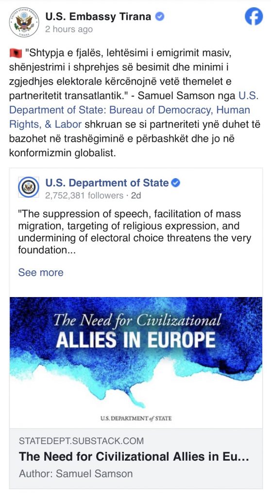 “Shtypja e fjalës, lehtësimi i emigrimit masiv, shënjestrimi i shprehjes së besimit dhe minimi i zgjedhjes elektorale kërcënojnë vetë themelet e partneritetit transatlantik.” – Samuel Samson nga U.S. Department of State: Bureau of Democracy, Human Rights, & Labor shkruan se si partneriteti ynë duhet të bazohet në trashëgiminë e përbashkët dhe jo në konformizmin globalist.”, shkruan Ambasada e SHBA.