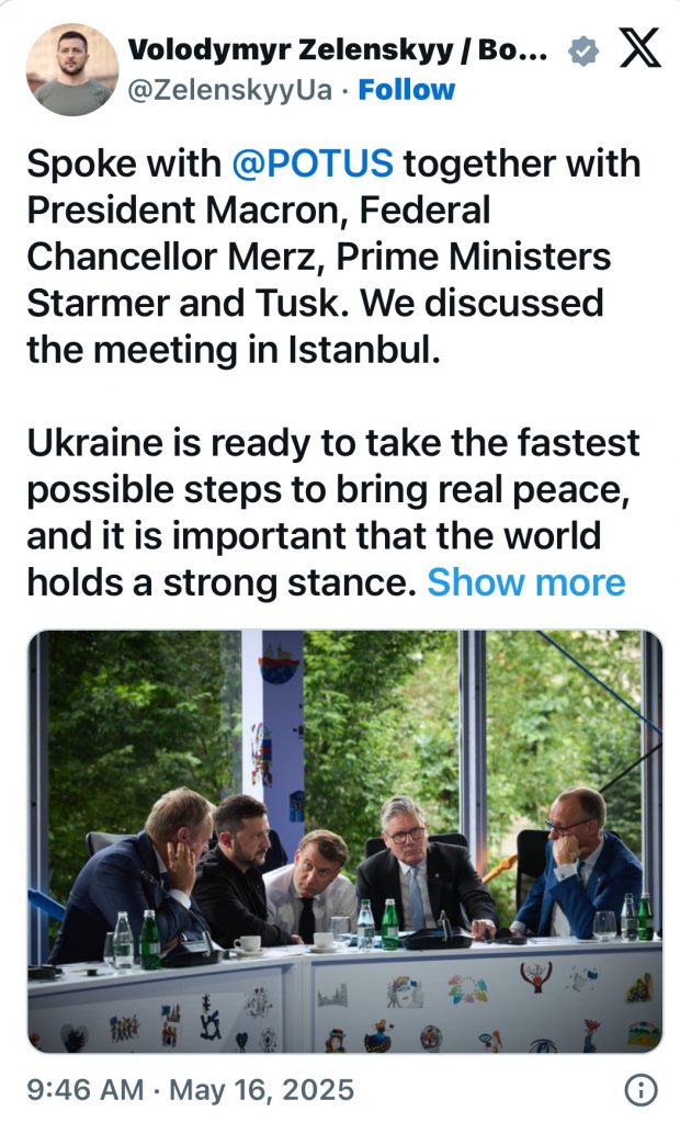 “Folëm me Donald Trump së bashku me Presidentin Macron, Kancelarin Federal Merz, Kryeministrat Starmer dhe Tusk. Diskutuam takimin në Stamboll. Ukraina eshtë gati të ndërmarrë hapat më të shpejtë të mundshëm për të sjellë paqe të vërtetë dhe ishtë e rëndësishme qe bota të mbajë një qëndrim të fortë.