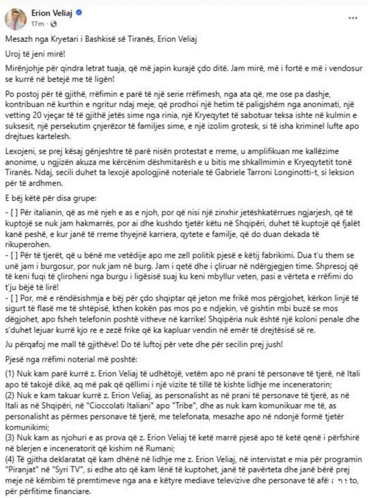 (4) Të gjitha deklaratat që kam dhënë në lidhje me z. Erion Veliaj, në intervistat e mia për programin “Piranjat” në “Syri TV”, si edhe ato që kam lënë të kuptohet, janë të pavërteta dhe janë bërë prej meje në këmbim të premtimeve nga ana e këtyre mediave televizive dhe personave të afërt me to, për përfitime financiare.”