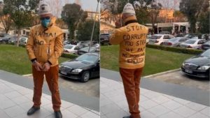 Ndërkohë që na ndajnë më pak se një orë që nga nisja e protestës së PD, një qytetar ka zgjedhur një mënyrë të veçantë për të dhënë mesazhin e tij. Ai ka regjistruar një video ku është me pranga në duar, ndërsa ka pasur një mesazh për kryeministrin Edi Rama dhe Belinda Ballukun. “Rama, Balluku në burg! Stop korrupsionit! Ju vidhni, ne paguajmë. Mjaft”, shkruhet në gjuhën angleze në rrobat e veshura prej tij.