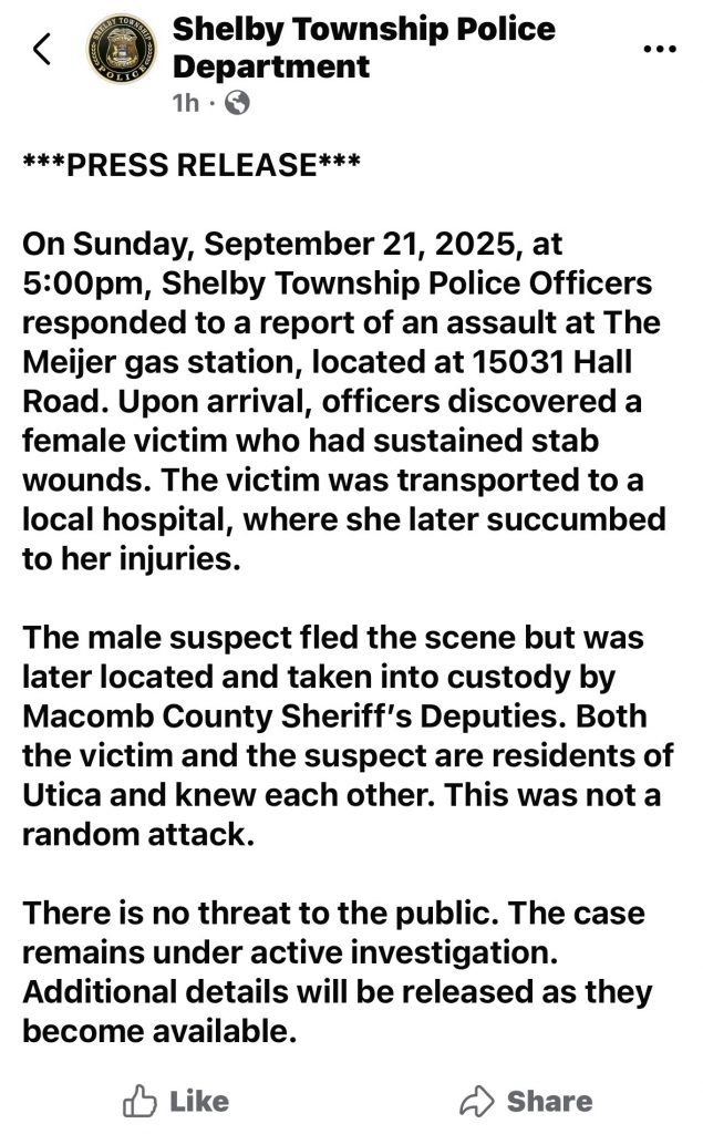 Një ngjarje e rëndë ka ndodhur pasditen e së shtunës në Shelby Township, ku një grua ka humbur jetën si pasojë e një sulmi me thikë në stacionin e karburantit Meijer Gas Station, në adresën 15301 Hall Road.