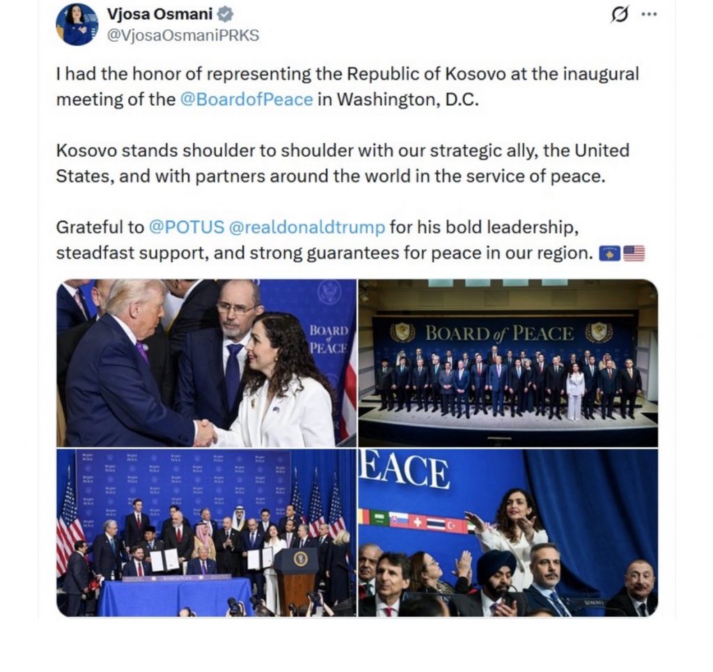 Presidentja e Republikës së Kosovës, Vjosa Osmani, ka bërë të ditur se ka përfaqësuar Kosovën në takimin inaugurues të Bordit të Paqes në Washington, D.C.. Përmes një postimi në rrjetin social X, ajo theksoi rëndësinë e këtij angazhimi si dëshmi e përkushtimit të Kosovës ndaj paqes dhe bashkëpunimit ndërkombëtar.