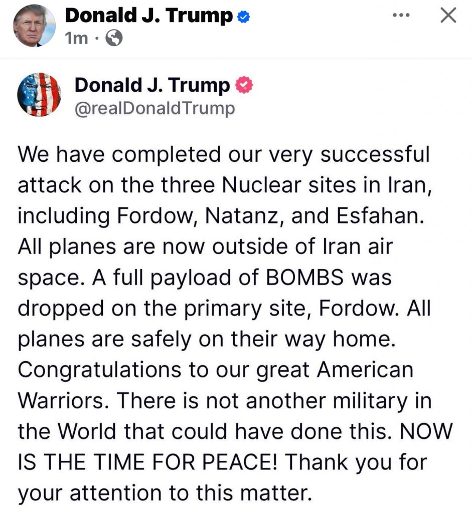 “Ne kemi përfunduar me sukses sulmin ndaj tre objekteve bërthamore në Iran, përfshirë Fordow, Natanz dhe Esfahan. Të gjitha avionët janë tani jashtë hapësirës ajrore iraniane. Një ngarkesë e plotë bombash është hedhur në objektivin kryesor, Fordow. Të gjithë avionët janë të sigurt dhe në rrugën e kthimit.”