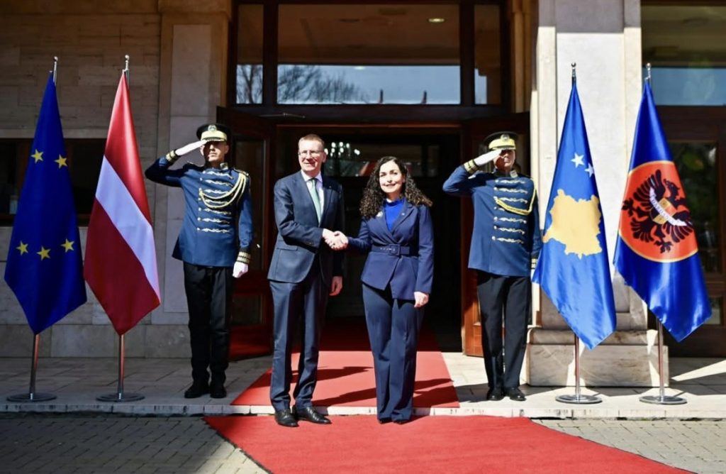 Presidentja e Republikës së Kosovës, Vjosa Osmani, mirëpriti sot në një vizitë pune Presidentin e Letonisë, Edgars Rinkēvičs, duke e cilësuar atë si një mik të çmuar të Kosovës dhe një mbështetës të palëkundur të rrugëtimit euroatlantik të vendit. Takimi u zhvillua në Presidencë, ku dy liderët diskutuan mbi marrëdhëniet bilaterale dhe bashkëpunimin ndërmjet dy vendeve.