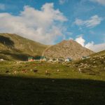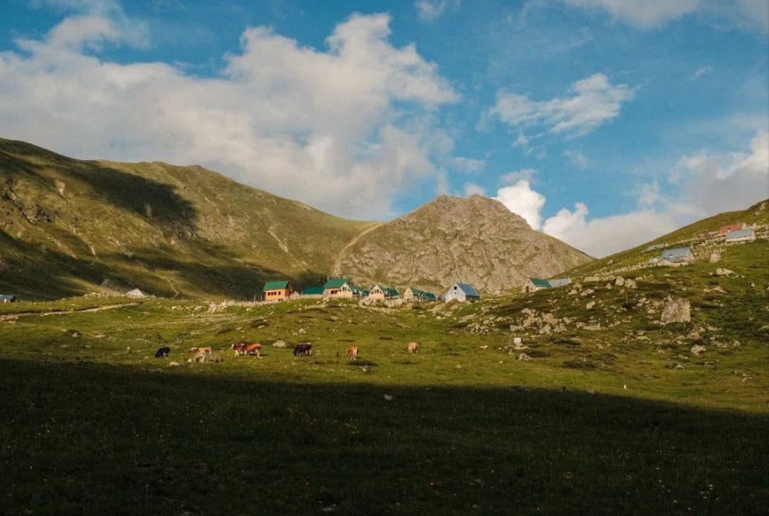 Në pamje duken disa shtëpiza dhe bagëti, si dhe natyra e bukur.