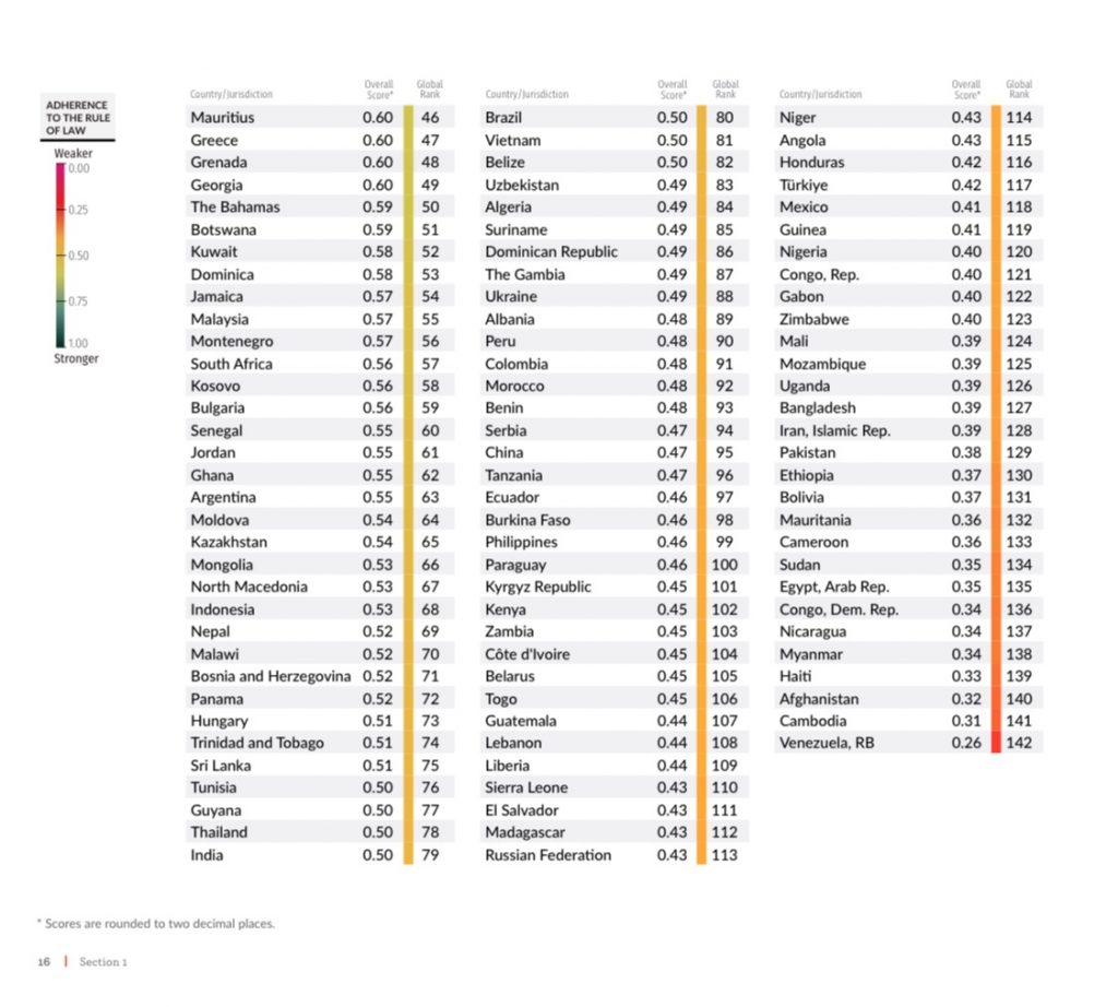 Që të fillojmë nga fillimi: WJP mat sundimin e ligjit nëpërmjet tetë faktorëve kryesorë — si “Kufizimet në pushtetin e qeverisë”, “Mungesa e korrupsionit”, “Qeverisja e hapur”, “Të drejtat themelore”, “Rendi dhe siguria”, “Zbatimi rregullator”, “Drejtësia civile” dhe “Drejtësia penale”.