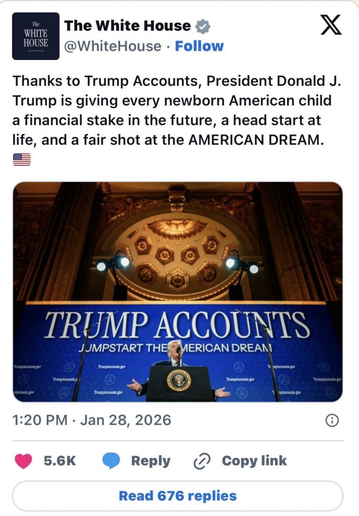 Me këtë program, administrata Trump synon t’i japë familjeve një mjet konkret për të ndërtuar pasuri dhe për të përshpejtuar mundësitë për brezat e ardhshëm — nga arsimimi, te blerja e një shtëpie, deri te investimi në sipërmarrje.