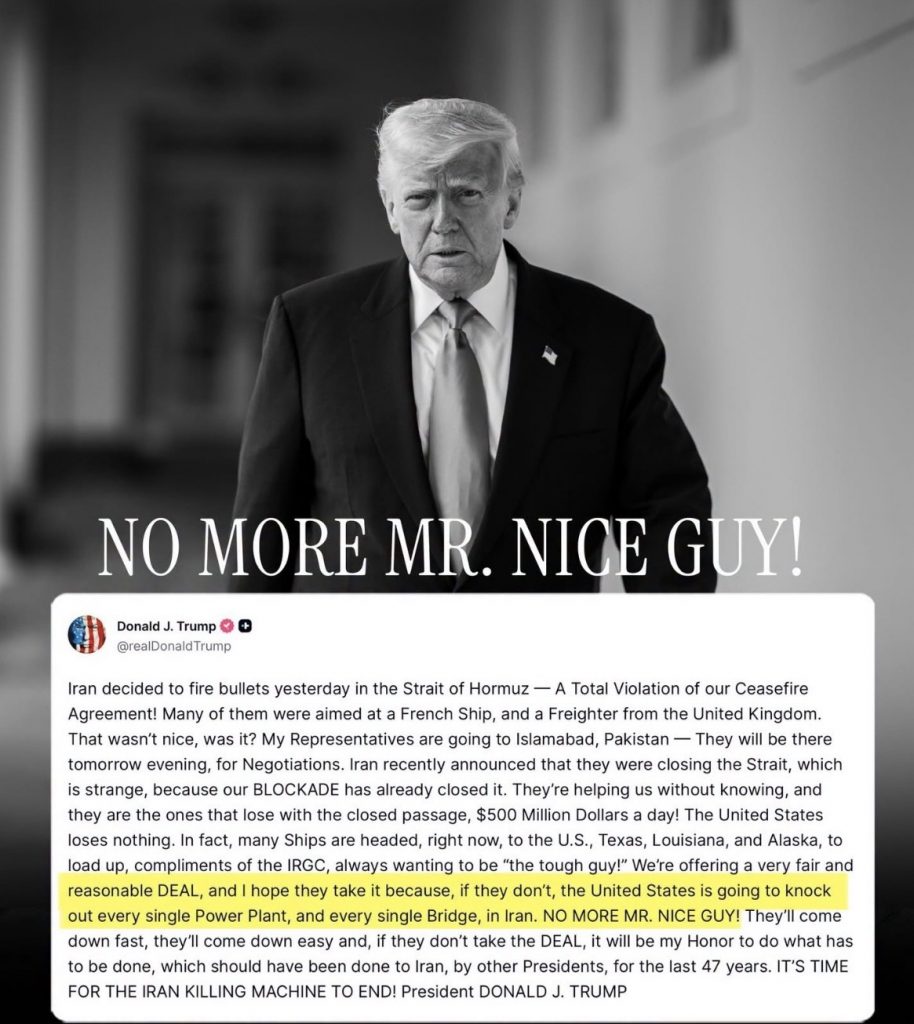Kjo nuk ishte mirë, apo jo? Përfaqësuesit e mi do të shkojnë në Islamabad, Pakistan – Ata do të jenë atje nesër në mbrëmje, për negociata. Irani njoftoi së fundmi se po e mbyllte Ngushticën, gjë që është e çuditshme, sepse BLLOKADA jonë e ka mbyllur tashmë. Ata po na ndihmojnë pa e ditur, dhe janë ata që humbasin me kalimin e mbyllur, 500 milionë dollarë në ditë! Shtetet e Bashkuara nuk humbasin asgjë. Në fakt, shumë anije po shkojnë, tani, drejt SHBA-së, Teksasit, Luizianës dhe Alaska, për t’u ngarkuar, komplimente të IRG-së, duke dashur gjithmonë të jenë “djali i fortë!” Ne po ofrojmë një MARRËVESHJE shumë të drejtë dhe të arsyeshme, dhe shpresoj që ta pranojnë sepse, nëse nuk e bëjnë, Shtetet e Bashkuara do të shkatërrojnë çdo termocentral dhe çdo urë në Iran. JO MË Z. DJALI I MIRË! Ata do të rrëzohen shpejt, do të rrëzohen lehtë dhe, nëse nuk e pranojnë MARRËVESHJEN, do të jetë nderi im të bëj atë që duhet bërë, të cilën duhet t’ia kishin bërë Iranit presidentët e tjerë, gjatë 47 viteve të fundit. ËSHTË KOHA QË MAKINA VRASËSE E IRANIT TË MBAROJË! Presidenti DONALD J. TRUMP”