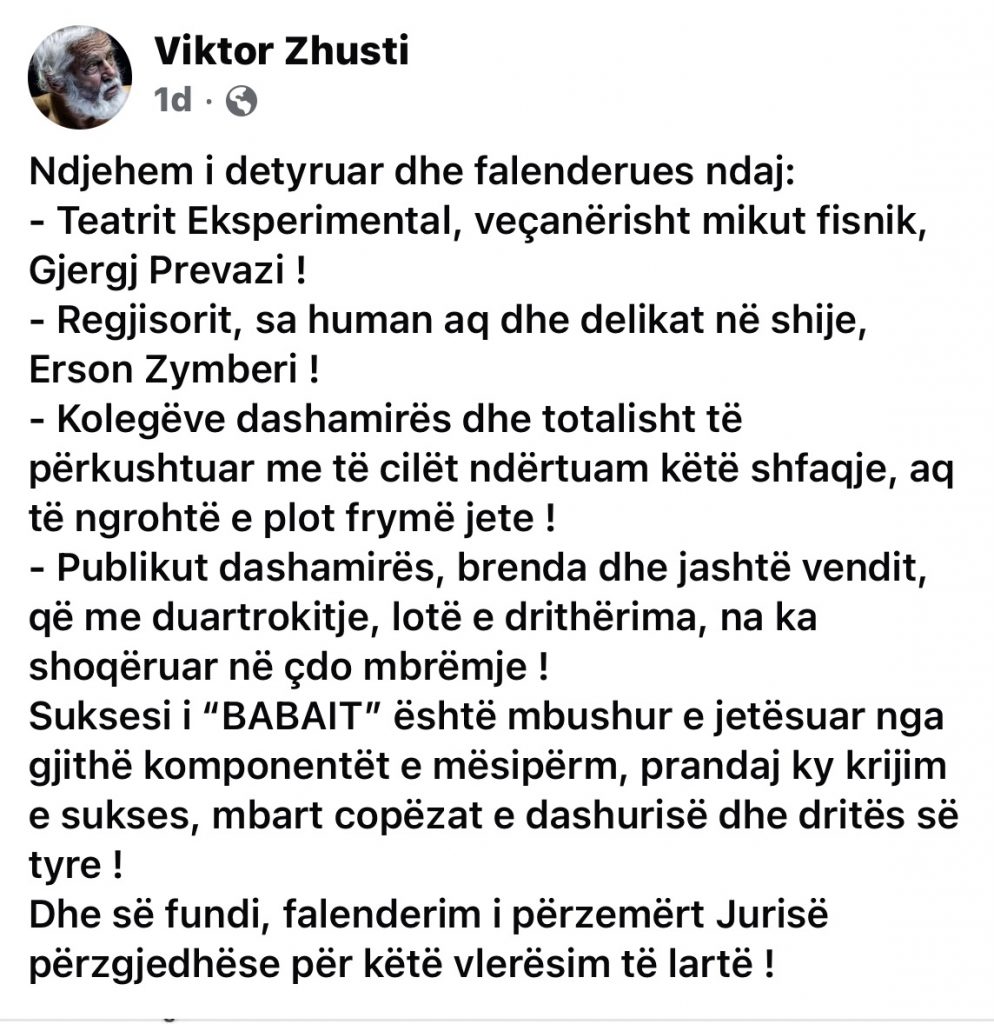Viktor Zhusti e shoqëroi çmimin e tij me një postim të ndjerë në Facebook, ku shprehu mirënjohjen e thellë për Teatrin Eksperimental, regjisorin Erson Zymberi, kolegët dhe publikun që e ka mbështetur në çdo hap. Me tone të sinqerta dhe të përzemërta, ai vuri në pah bashkëpunimin, respektin dhe emocionet që e kanë shoqëruar gjatë gjithë këtij projekti. Falënderimi i tij ndaj jurisë dhe të gjithë atyre që kontribuan në këtë shfaqje e reflekton qartë modestinë dhe madhështinë e tij si artist.